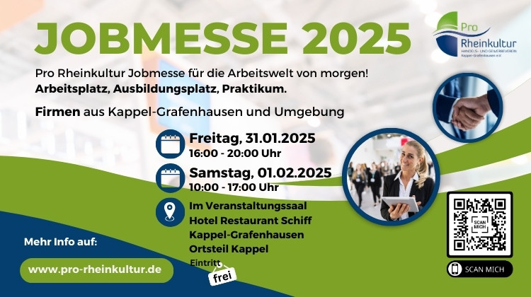 Die Jobmesse findet im Veranstaltungssaal des Hotel Restaurant Schiff statt und ist am Freitag von 16:00 bis 20:00 Uhr sowie am Samstag von 10:00 bis 17:00 Uhr geöffnet. Der Eintritt ist frei. Weitere Informationen sind auf der Website www.pro-rheinkultur.de zu finden.
